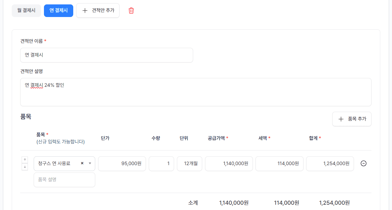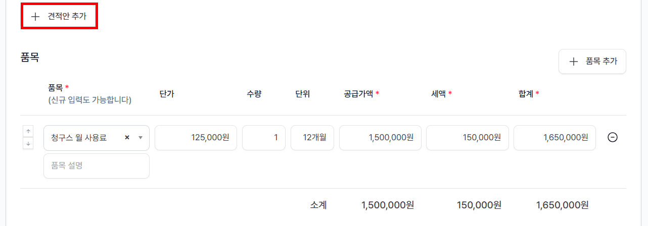 각 견적안마다 품목, 수량, 단가, 공급가액, 세액, 합계를 별도로 입력할 수 있습니다.