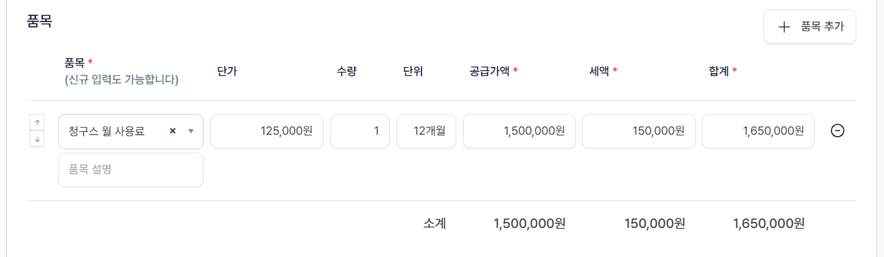 품목명/공급가액/세액/합계 등 필수 항목을 빠짐없이 입력해 주세요.