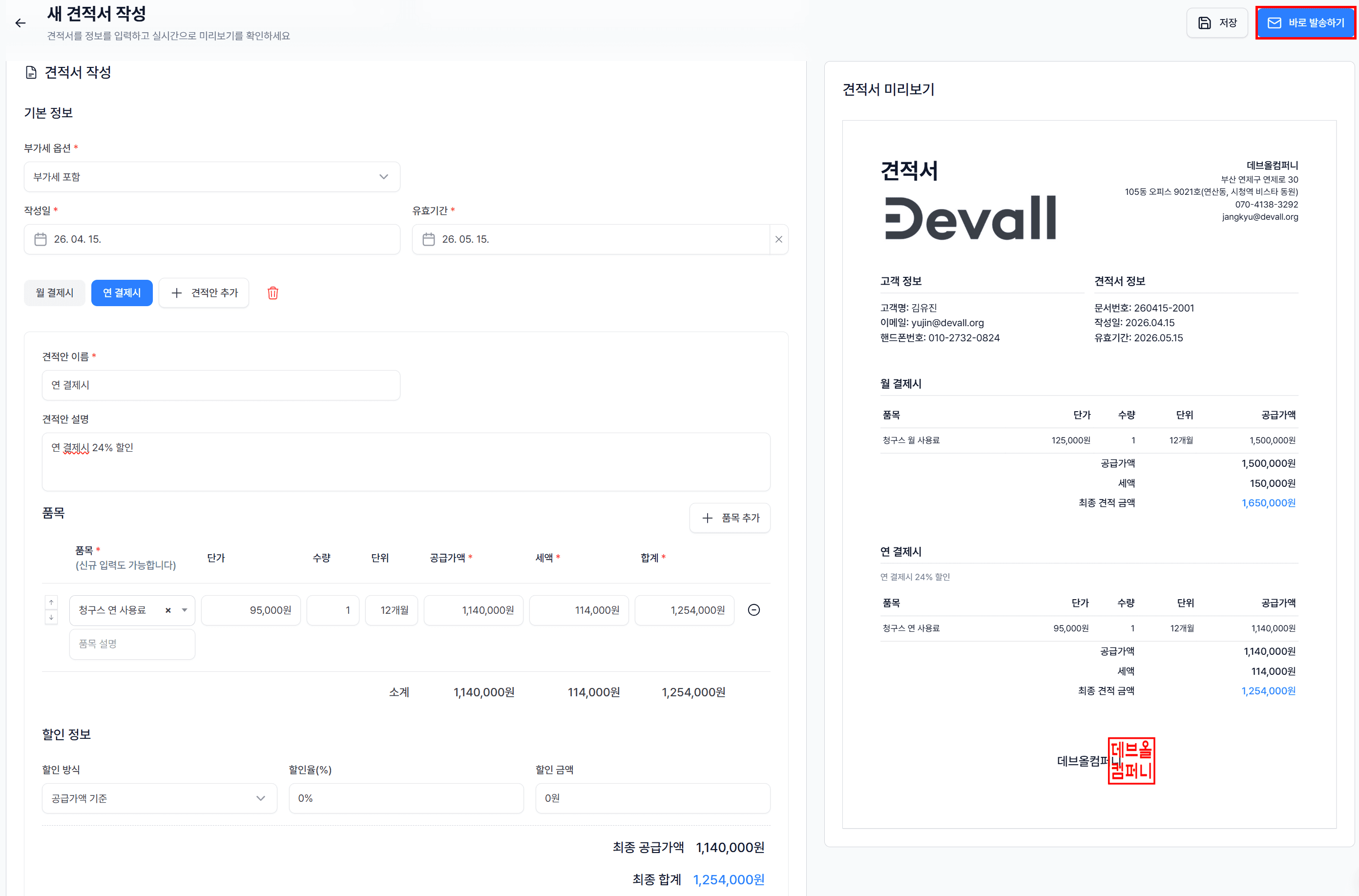 입력한 견적서가 저장과 동시에 고객 이메일로 자동 발송됩니다.