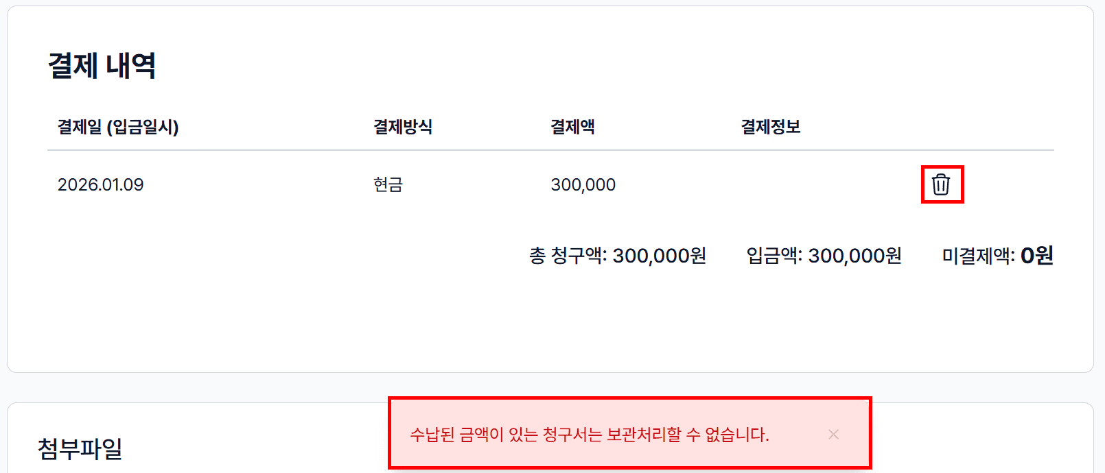 해당 청구서를 보관하려면, 먼저 결제 내역을 삭제해 주세요.