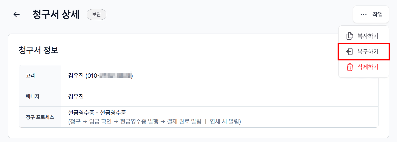 청구서 보관함 → [복구하기]