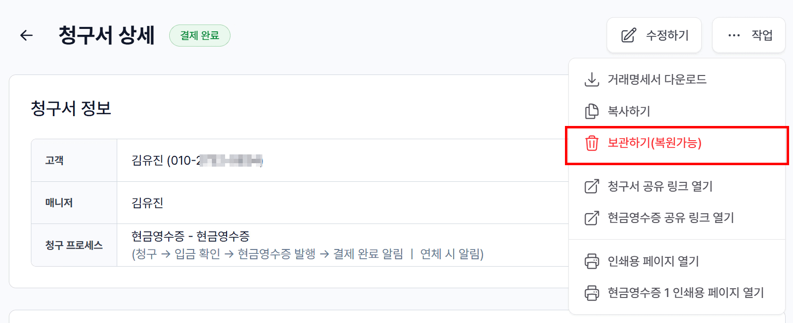 청구서 상태: ‘발행 완료’ 인 경우만 가능