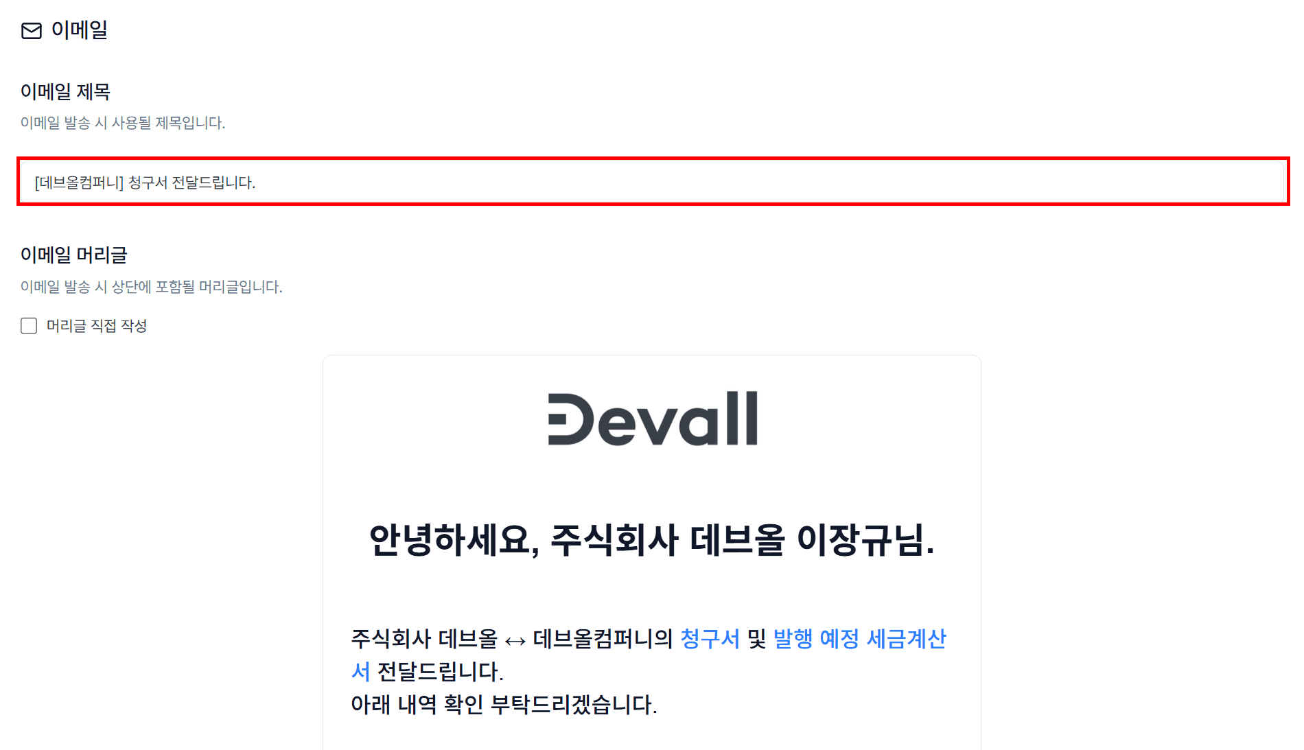 견적서·청구서 발송 시 이메일 제목과 머리글을 원하는 대로 수정할 수 있습니다. 고객에게 더 맞춤화된 메일을 보내보세요!