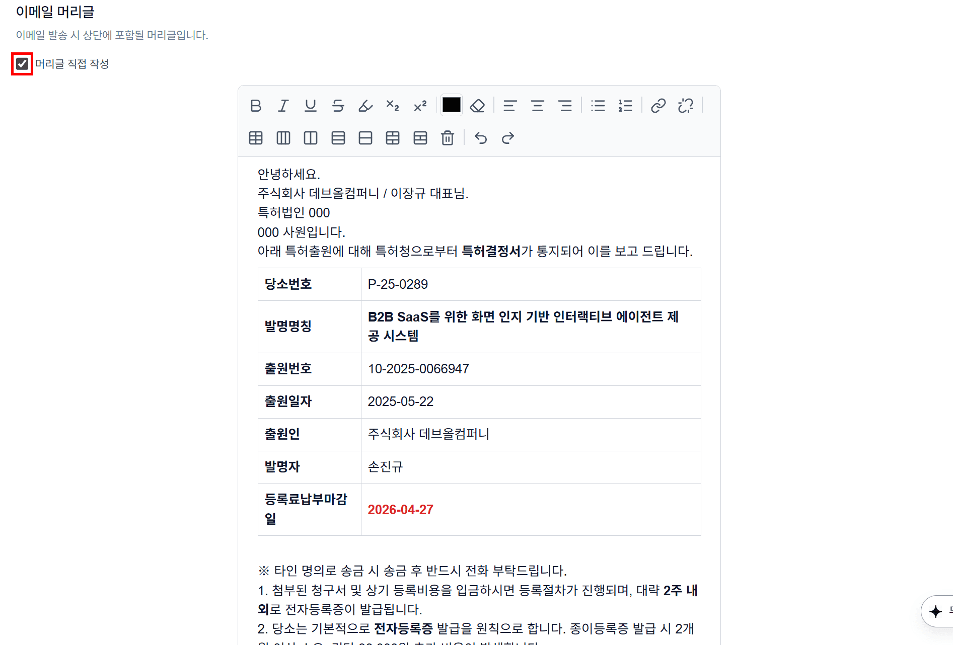 이메일 본문 상단 인사말을 직접 입력